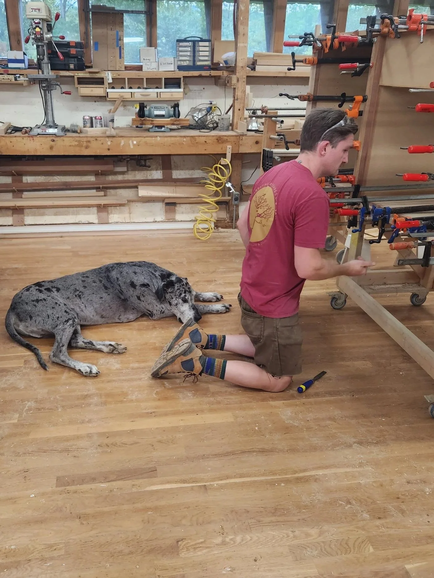 D.J. is originally from rural Western Pennsylvania where his passion for woodworking began with building projects with his father and uncles and years of high school shop class. However, he went on to study chemistry and physics at Slippery Rock University in Western, PA which led to a career in biotech. Eventually, he took on a historical home renovation/restoration project in Ohio that rekindled his love for woodworking and ultimately led to a career change as a woodworker living in the Northeast Kingdom. Now residing in Central, VT, he spends most of his time outside of the shop bicycling throughout Vermont and with his Great Dane, Bo Peep (pictured).